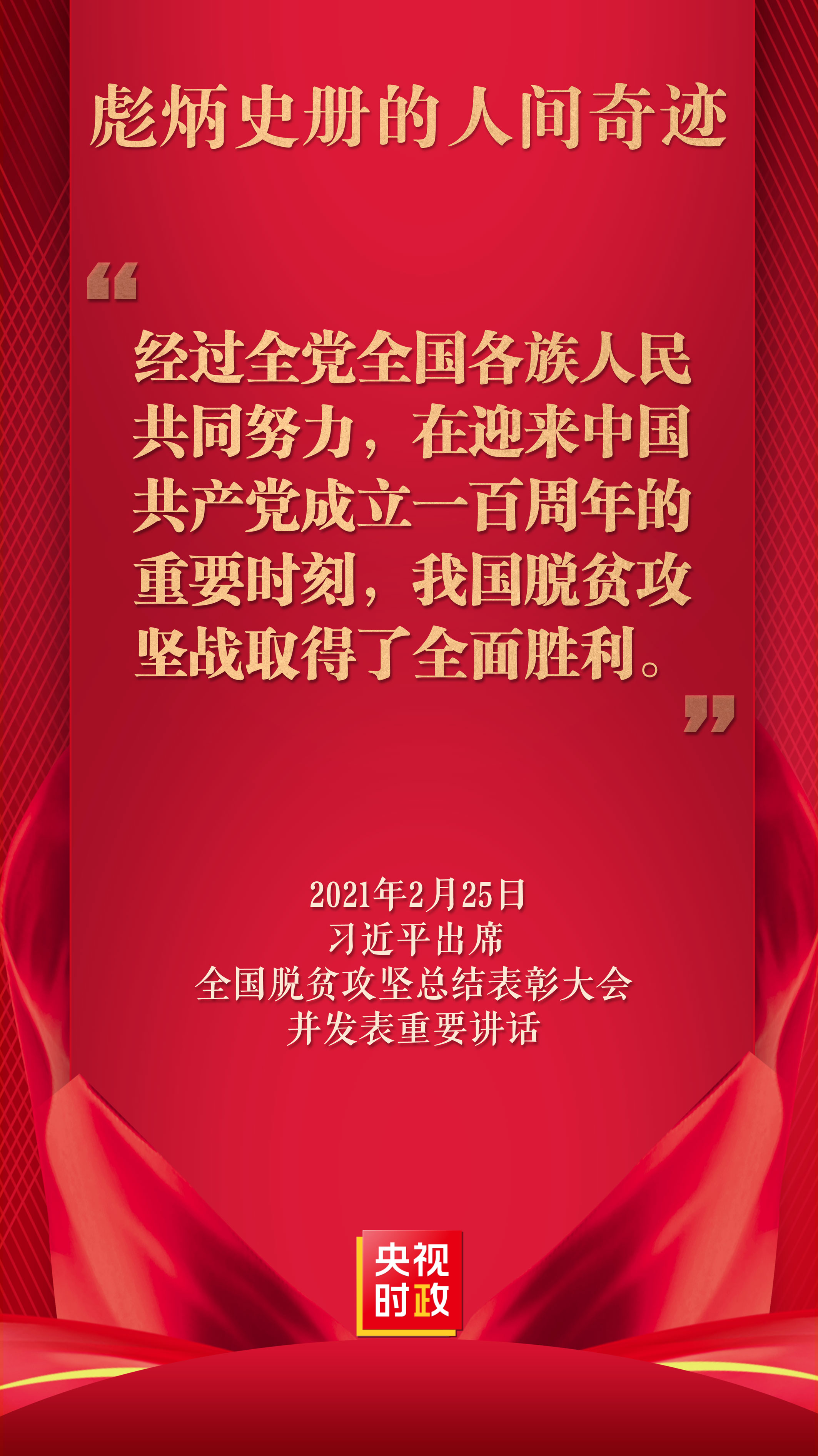 習(xí)近平莊嚴(yán)宣告,經(jīng)過全黨全國各族人民共同努力,在迎來中國共產(chǎn)黨成立一百周年的重要時(shí)刻,我國脫貧攻堅(jiān)戰(zhàn)取得了全面勝利,現(xiàn)行標(biāo)準(zhǔn)下9899萬農(nóng)村貧困人口全部脫貧,832個(gè)貧困縣全部摘帽,12.8萬個(gè)貧困村全部出列,區(qū)域性整體貧困得到解決,完成了消除絕對(duì)貧困的艱巨任務(wù),創(chuàng)造了又一個(gè)彪炳史冊(cè)的人間奇跡!這是中國人民的偉大光榮,是中國共產(chǎn)黨的偉大光榮,是中華民族的偉大光榮!