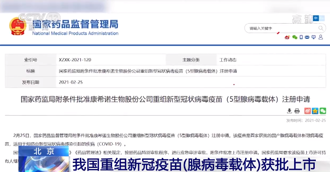 25日,國(guó)家藥監(jiān)局根據(jù)《疫苗管理法》和《藥品管理法》的相關(guān)規(guī)定,按照藥品特別審批程序,進(jìn)行應(yīng)急審評(píng)審批,附條件批準(zhǔn)了重組新冠疫苗(腺病毒載體)的上市注冊(cè)申請(qǐng),并要求上市許可持有人繼續(xù)開展相關(guān)研究工作,完成附條件的要求,及時(shí)提交后續(xù)研究結(jié)果。