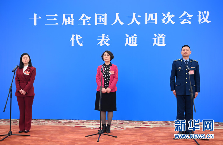3月5日,第十三屆全國人民代表大會第四次會議舉行首場“代表通道”采訪活動。這是全國人大代表袁晶、郭艷玲、余海龍(從左至右)通過網絡視頻方式接受采訪。新華社記者 金良快 攝