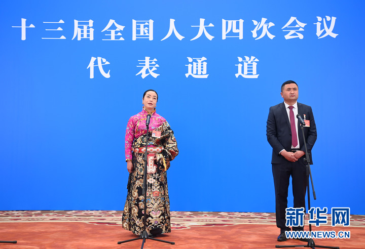3月5日,第十三屆全國人民代表大會第四次會議舉行首場“代表通道”采訪活動。這是全國人大代表孔慶菊(左)、木沙江·努爾墩通過網絡視頻方式接受采訪。新華社記者 金良快 攝