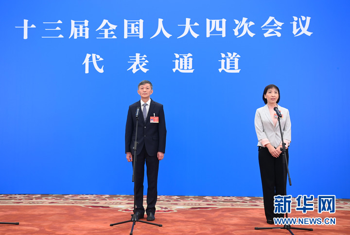 3月5日,第十三屆全國人民代表大會第四次會議舉行首場“代表通道”采訪活動。這是全國人大代表蘇伯民(左)、查艷通過網絡視頻方式接受采訪。新華社記者 金良快 攝