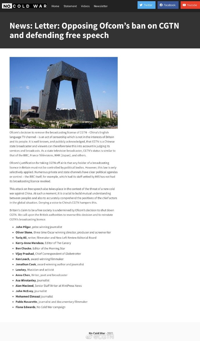3月9日,多位國際知名人士在英國《晨星報》和“拒絕新冷戰”機構官方網站聯合發表署名公開信,反對英國通訊管理局對中國國際電視臺(CGTN)的禁令。參與此次聯名的包括澳大利亞著名戰地記者、電影導演約翰·皮爾格(John Pilger),三次獲得奧斯卡獎的導演、制片人、編劇奧利佛·斯通(Oliver Stone)以及英國電影學院獎終身成就獎得主肯·洛奇等多位知名人士,包括在英國享有一定聲譽的作家、記者編輯、電影人、音樂人等。