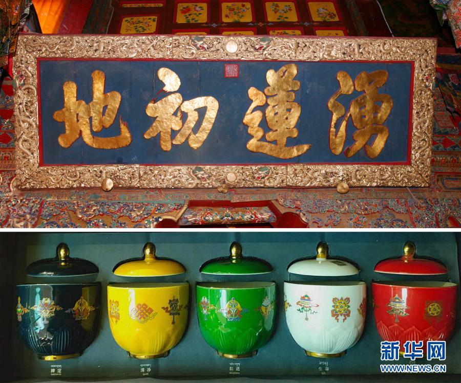 拼版照片:上圖為懸掛于布達(dá)拉宮西大殿正中上方、乾隆賜予八世達(dá)賴?yán)锏挠P金字匾額“涌蓮初地”;下圖為布達(dá)拉宮紅山腳下文創(chuàng)體驗(yàn)店內(nèi)的“蓮花五蘊(yùn)杯”文創(chuàng)瓷器(1月26日攝)。新華社記者 孫非 攝