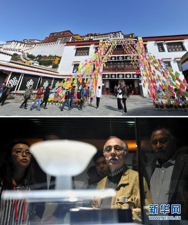 拼版照片:上圖為布達(dá)拉宮珍寶館文物展出現(xiàn)場(chǎng)(2019年10月5日攝),下圖為參觀者在觀看布達(dá)拉宮精品文物展上展出的瓷器(2016年9月12日攝)。新華社記者 晉美多吉 攝