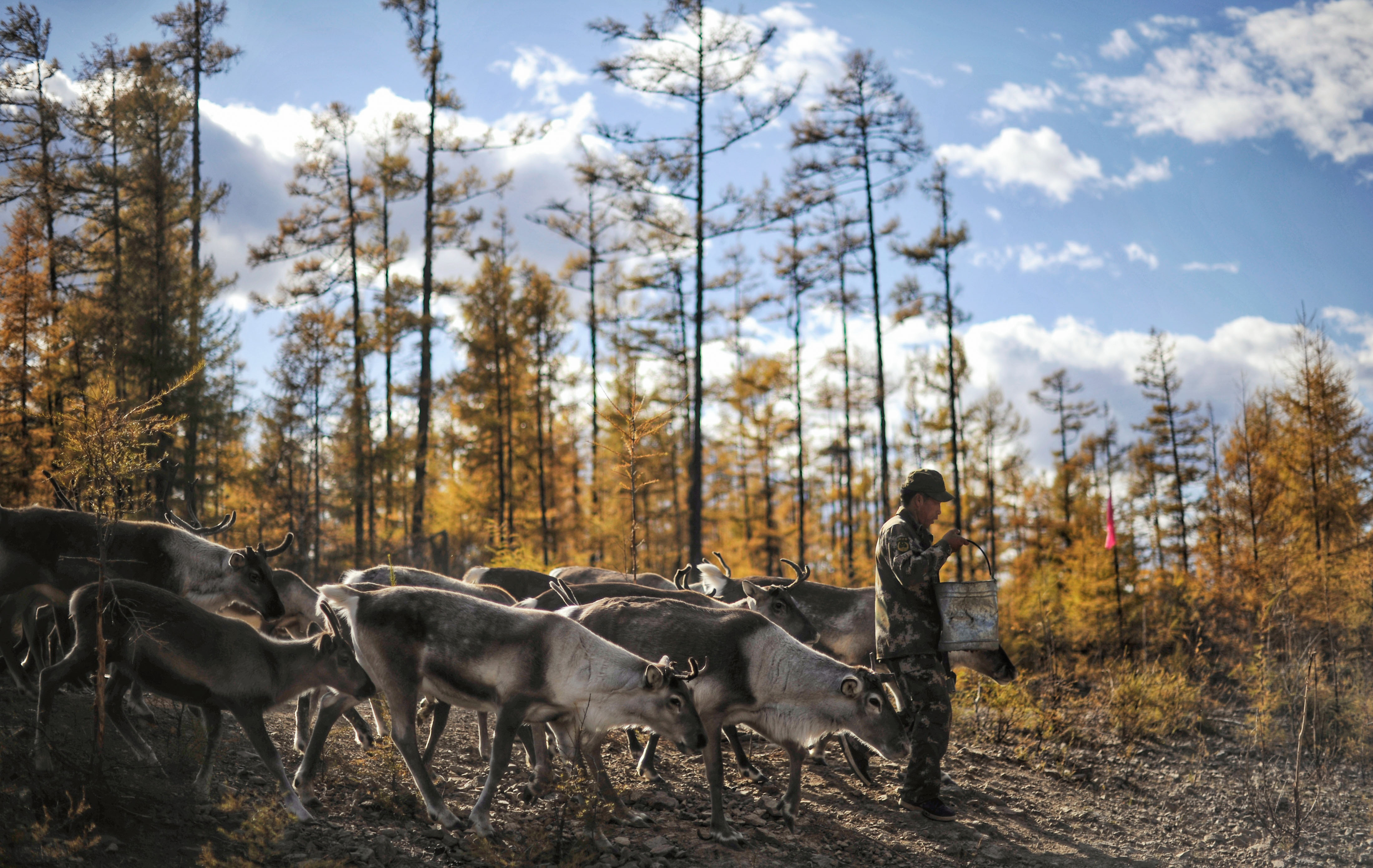 內蒙古大興安嶺根河林業局約安里林場,林場職工張國華為馴鹿補充飼料。