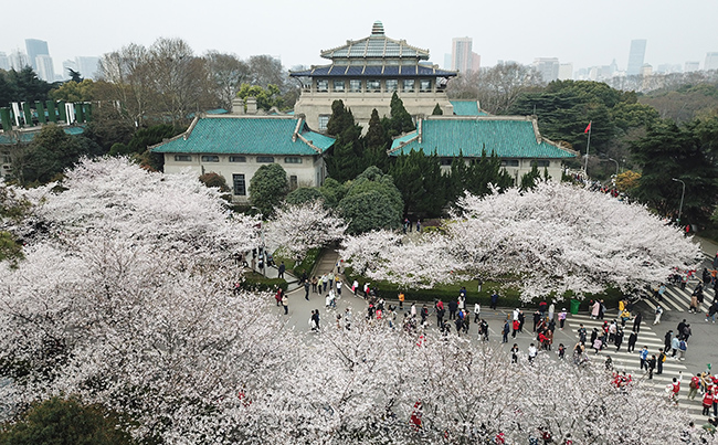 3月13日,來自各地的援鄂醫(yī)護人員在武漢大學(xué)校園共赴櫻花之約(無人機照片)。