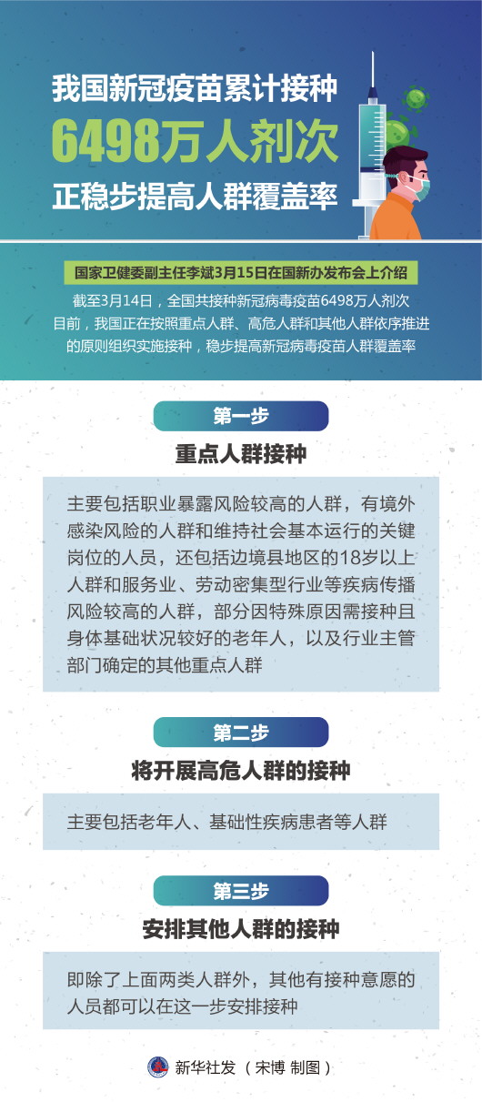 “截至3月14日,我國共接種新冠病毒疫苗6498萬人劑次!眹倚l生健康委副主任李斌表示,目前,我國正在按照重點人群、高危人群和其他人群依序推進的原則組織實施接種,穩步提高新冠病毒疫苗人群覆蓋率。