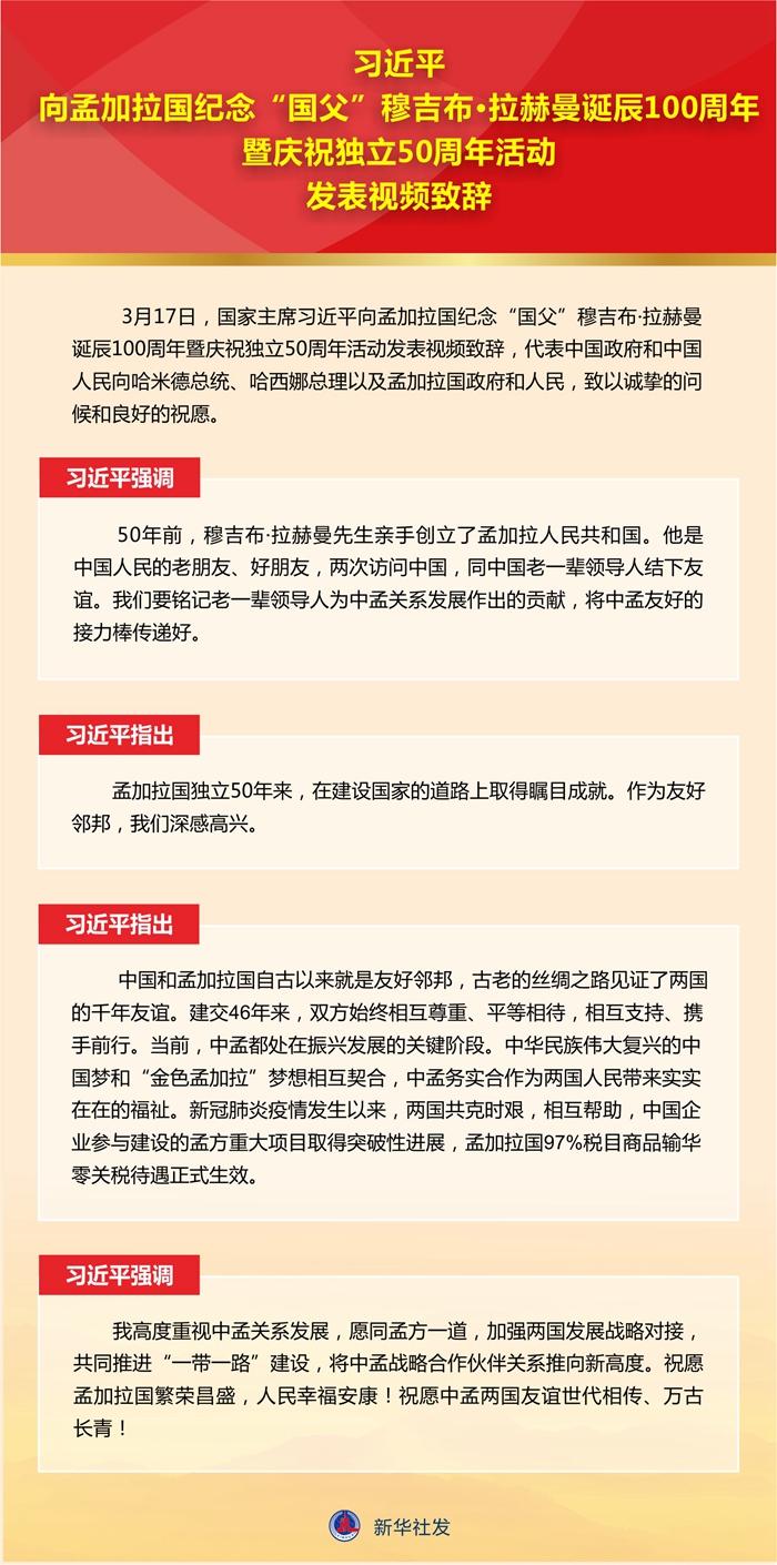 新華社北京3月17日電 3月17日,國家主席習(xí)近平向孟加拉國紀(jì)念“國父”穆吉布·拉赫曼誕辰100周年暨慶祝獨(dú)立50周年活動發(fā)表視頻致辭,代表中國政府和中國人民向哈米德總統(tǒng)、哈西娜總理以及孟加拉國政府和人民,致以誠摯的問候和良好的祝愿。