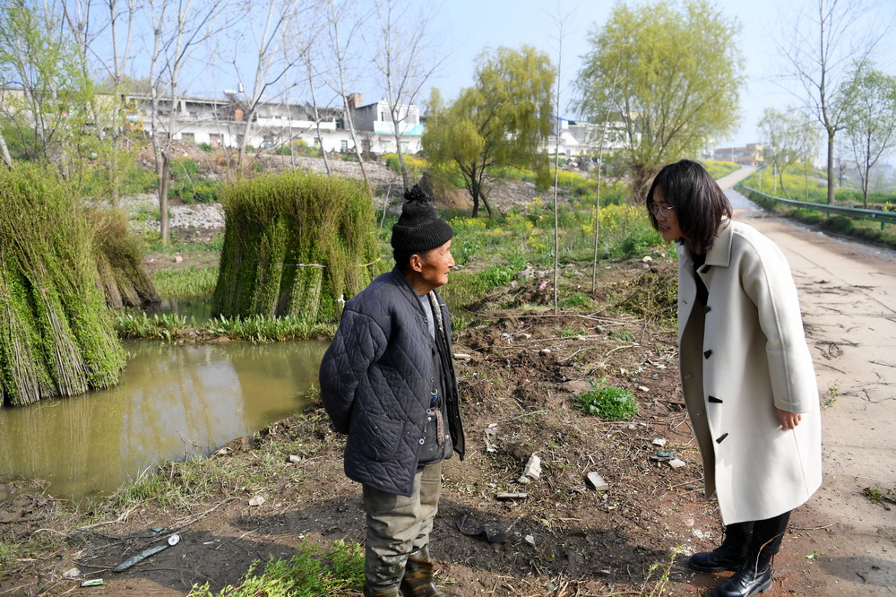 劉曉妮(右)在阜南縣郜臺鄉曹臺村與村民交流(3月12日攝)。新華社記者 劉軍喜 攝