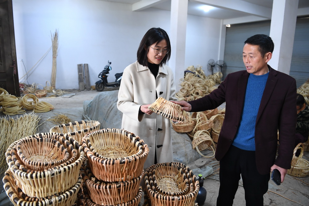劉曉妮(左)在阜南縣郜臺鄉的柳編加工企業內調研(3月12日攝)。新華社記者 劉軍喜 攝