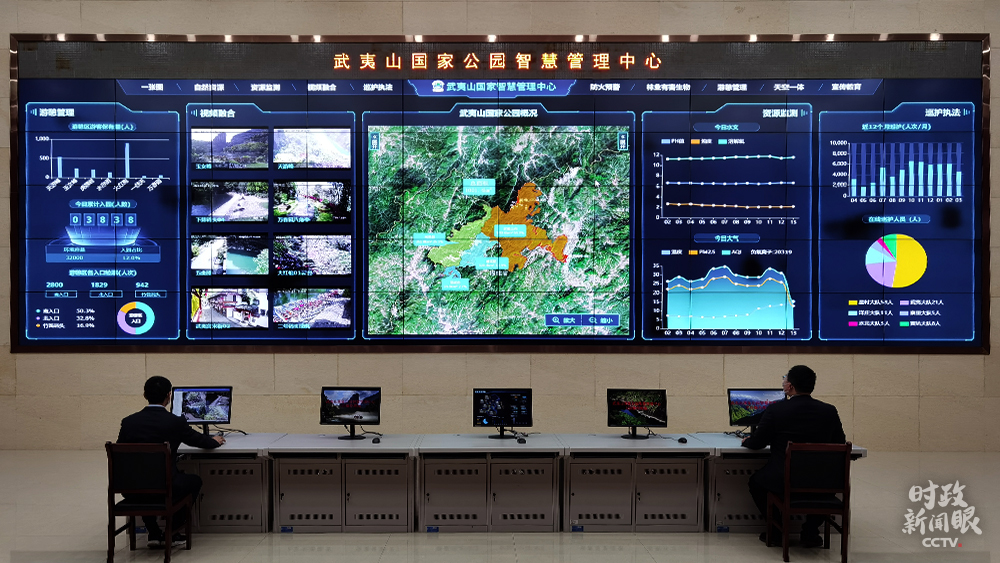 智慧管理中心是武夷山國家公園的“智慧大腦”,綜合運用互聯網、物聯網、衛(wèi)星遙感等信息技術,通過大數據采集和分析,可以實時掌握當日入園人數,監(jiān)測預警水質、大氣、森林防火等情況。