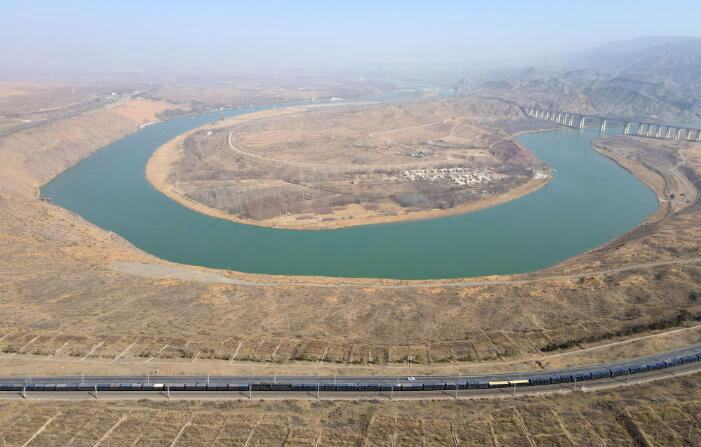 黃河流經寧夏中衛(wèi)市沙坡頭區(qū)(3月3日攝,無人機照片)。 新華社記者 唐如峰 攝