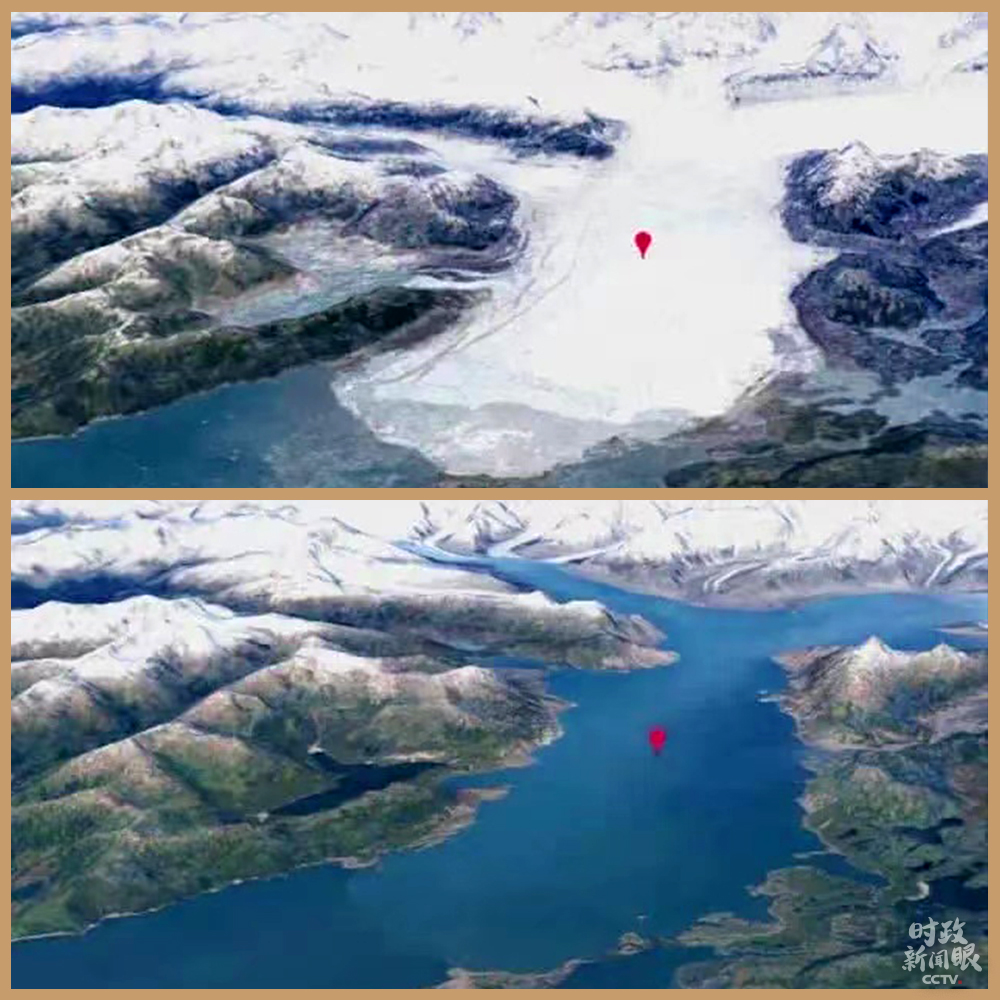 △阿拉斯加,哥倫比亞冰川(上圖為1984年,下圖為2020年)。哥倫比亞冰川是世界上變化最快的冰川之一,通過照片能清晰看到氣候變暖導致冰川不斷消退。(資料圖)