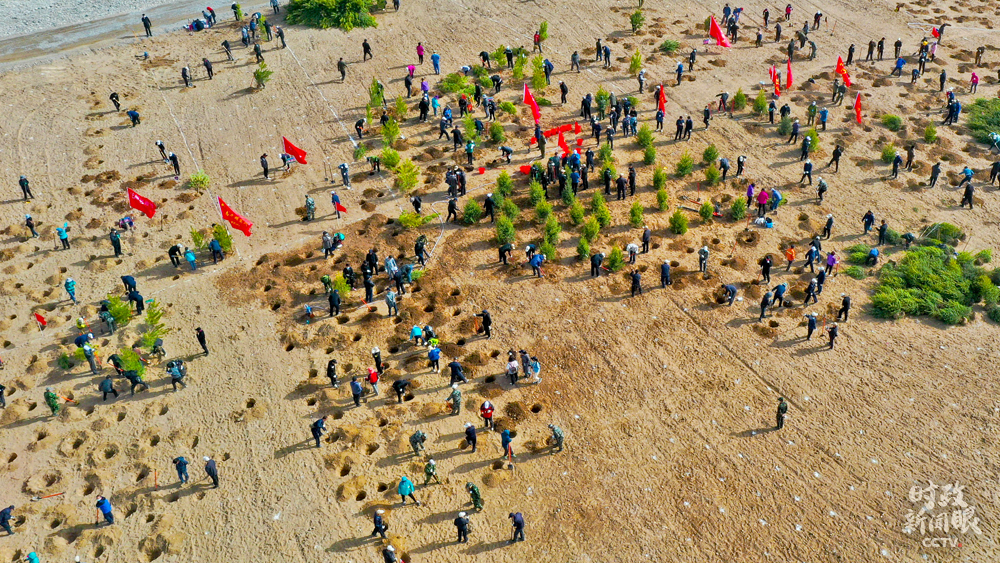 △4月15日,甘肅張掖萬畝常青林基地植樹現場。(圖/視覺中國)