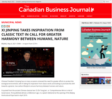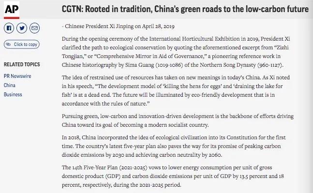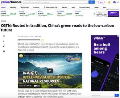 CGTN官網發布英語特稿《經典中的智慧:中國走向低碳未來的綠色道路》,在解讀典故的同時,介紹了中國政府在綠色發展領域所采取的積極舉措以及一系列成就。目前官網相關報道已經獲得了來自美國、英國、加拿大、意大利、澳大利亞、印度、墨西哥、古巴、秘魯、西班牙、阿根廷等國家和地區的819家海外主流網絡媒體轉載。代表轉載媒體有美聯社、雅虎財經、市場觀察、晨星網、意大利克羅諾斯通訊社、國際金融時報、澳聯社、印度今日商業、印度新德里時報、古巴經濟學家報等,累計觸達海外受眾達5.2億人次。