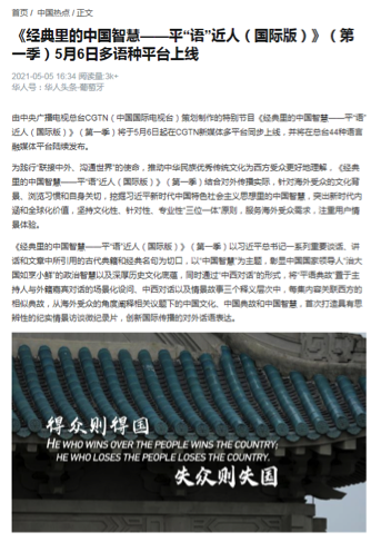 總臺44種語言融媒體編譯播發了《經典里的中國智慧——平“語”近人(國際版)》(第一季)第一集,通過臉書、優兔、推特等海外社交媒體廣泛傳播。