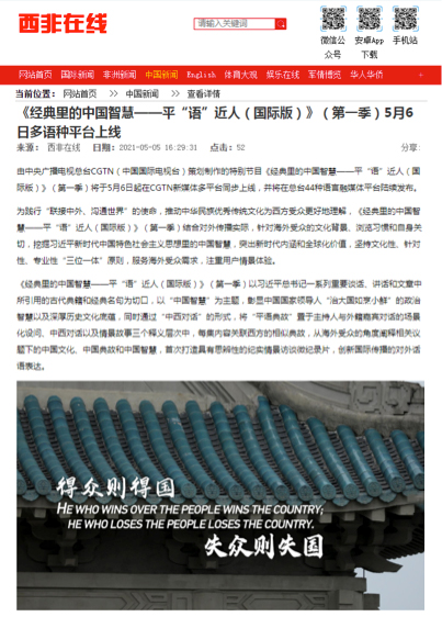 《經典里的中國智慧——平“語”近人(國際版)》(第一季)一上線即引發多家華文媒體高度關注。美國商業新聞網、北歐時報網、日本華商網、歐僑網、葡新報、華人頭條、西非在線、非洲時報等網站,以及香港《文匯報》、香港明珠傳媒、香港立場傳媒、香港觀察、粵澳傳媒、澳門眀言傳媒、大澳熱點等境外華文媒體轉引轉載相關報道。