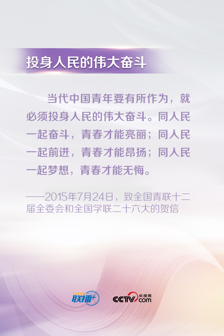 習近平總書記一直以來都十分關心青年成長成才,常常走近青年、傾聽青年、鼓勵青年。他說,“青年最富有朝氣、最富有夢想”,“中華民族偉大復興終將在廣大青年的接力奮斗中變為現實”。央視網《聯播+》特梳理總書記對廣大青年的寄語,與您一起學習。