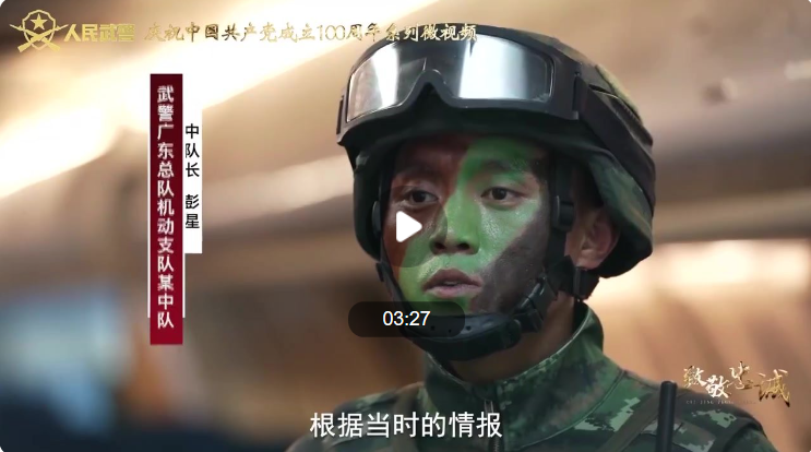 為慶祝中國共產黨成立100周年,自2021年6月7日起,人民武警新媒體矩陣連續推出由武警部隊政治工作部宣傳文化中心制作的40集系列微視頻《致敬忠誠》。本期為您介紹武警廣東總隊機動支隊某中隊中隊長彭星。