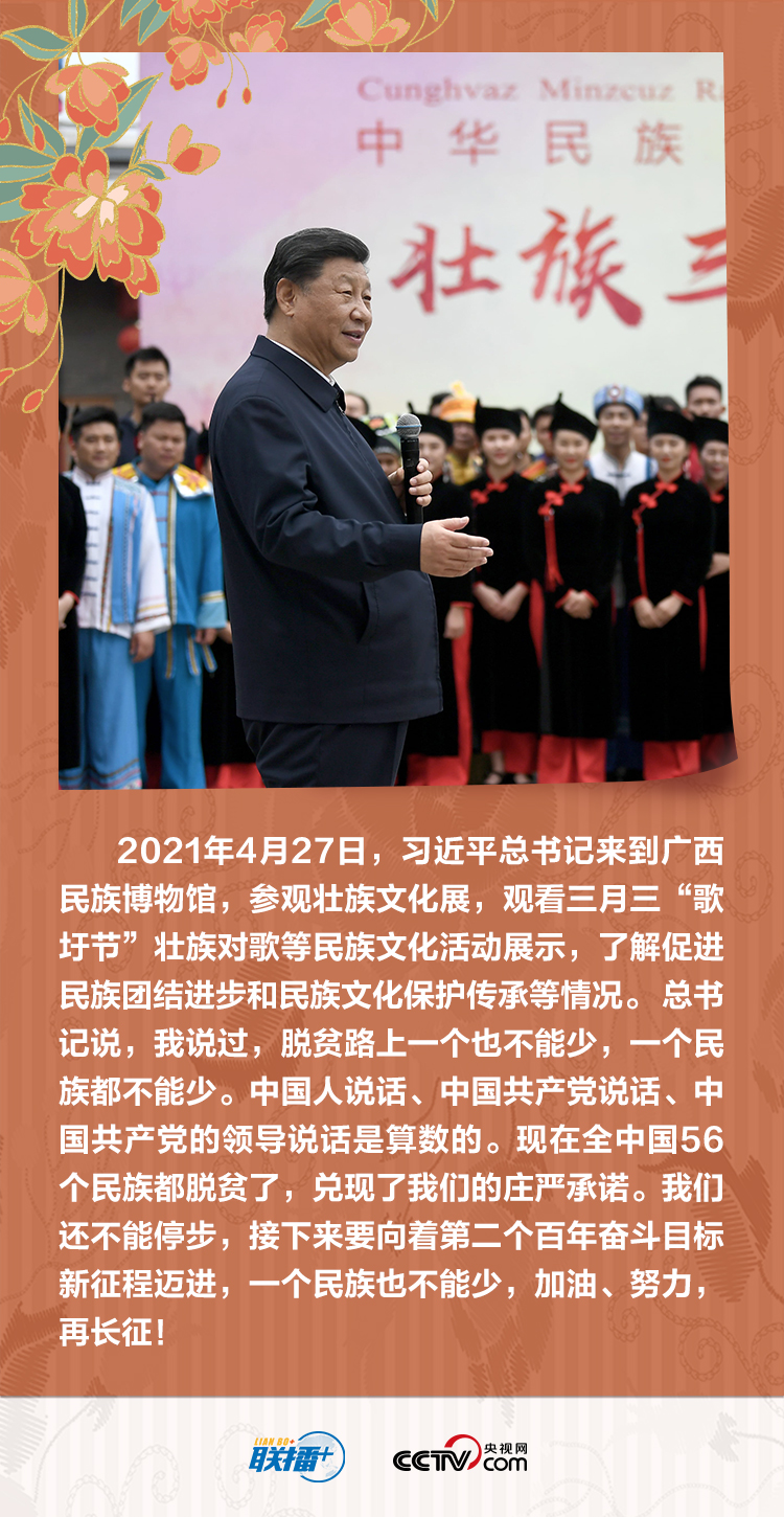 黨的十八大以來,總書記多次深入少數民族地區考察,足跡遍及祖國北疆、西南邊陲、雪域高原、天山南北,他頻頻強調“一個民族都不能少”這個莊嚴承諾。