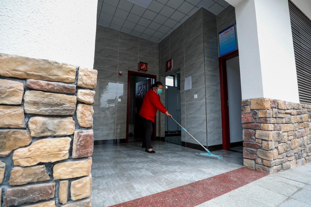 2020年4月8日,重慶市沙坪壩區中梁鎮龍泉村村民吳桂慧在打掃村里的公廁。 新華社發(黃偉 攝)