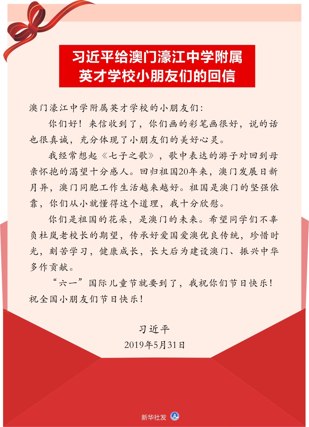↑習(xí)近平給澳門濠江中學(xué)附屬英才學(xué)校小朋友們的回信。新華社發(fā)