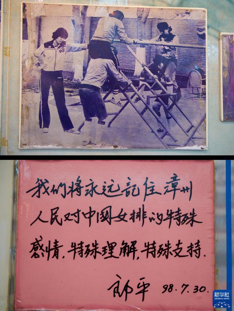 這是福建漳州體育訓練基地中國女排騰飛館內展出的郎平等老女排隊員當年訓練的照片(上),以及郎平于1998年寫給漳州人民的寄語(2016年8月31日翻拍)。新華社記者姜克紅攝