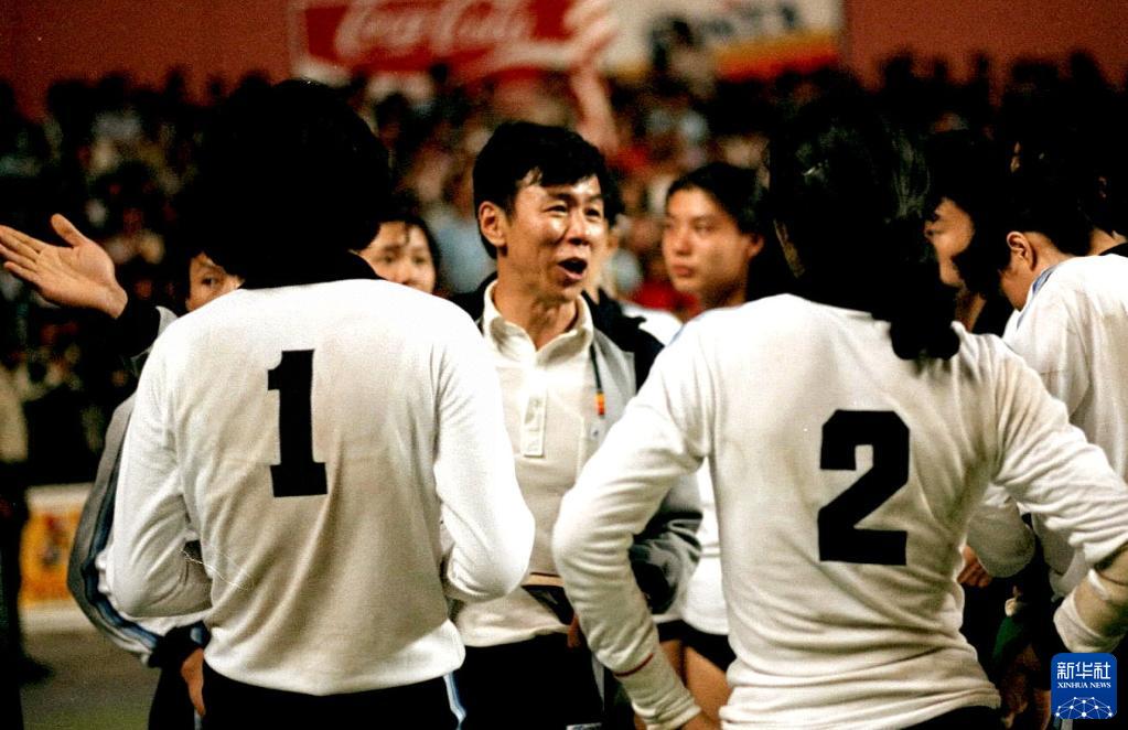 1982年9月20日,袁偉民在第九屆女排世錦賽中指導女排隊員。新華社發