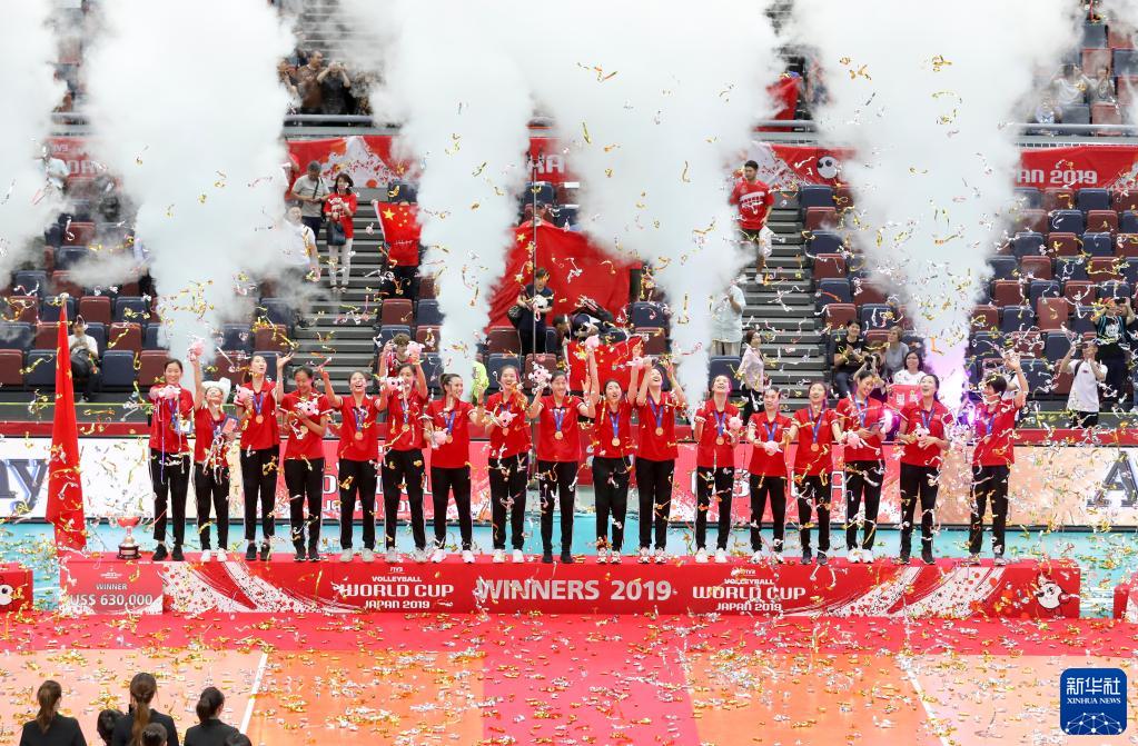 2019年9月29日,第十三屆女排世界杯頒獎儀式在日本大阪舉行,中國隊在本屆比賽中以十一連勝的戰績奪得了冠軍。新華社記者杜瀟逸攝