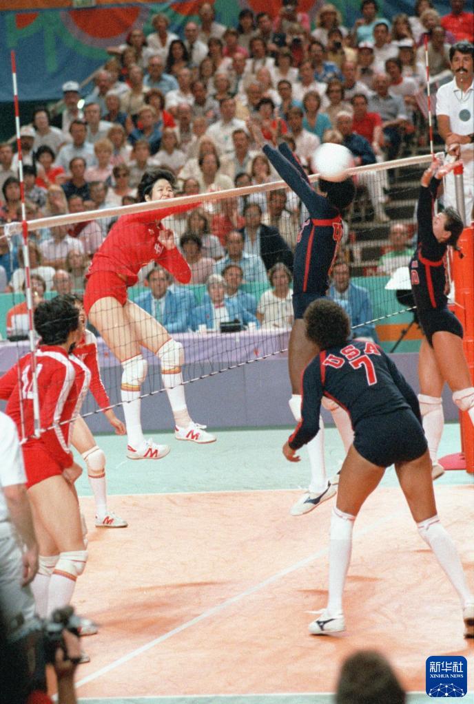 1984年8月7日,中國隊主攻手郎平在洛杉磯奧運會女排決賽中大力扣殺。新華社記者官天一攝