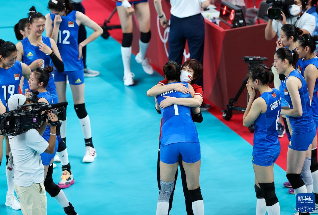 2021年8月2日,中國隊主教練郎平在比賽后與隊員一一擁抱。當日,在東京奧運會排球項目女排小組賽中,中國隊以3比0戰勝阿根廷隊。新華社記者 丁汀 攝
