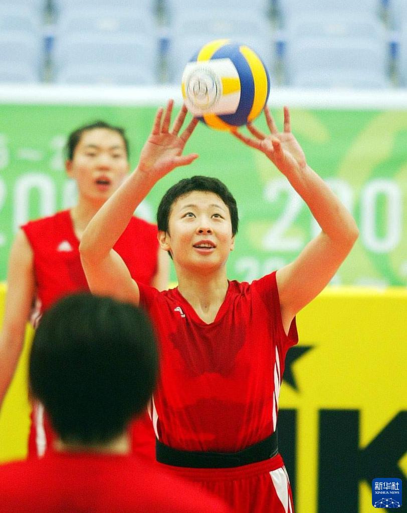 2005年6月23日,中國女排隊員馮坤(右)、張萍(后)在進行戰術訓練。新華社記者畢明明攝