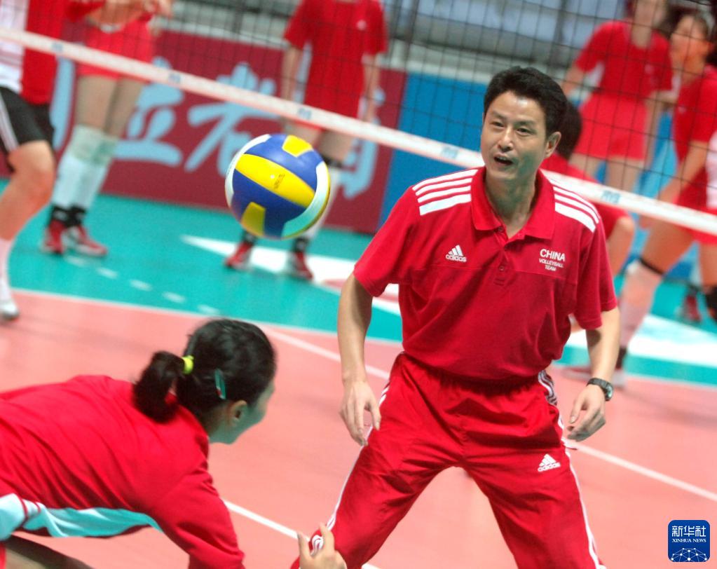 2006年8月30日,中國女排主教練陳忠和(右)在寧波北侖訓練基地指導隊員進行賽前訓練。新華社記者徐昱攝