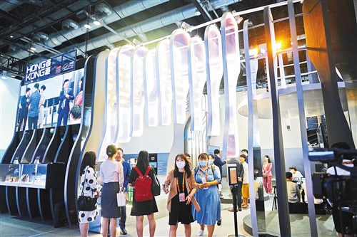 服貿(mào)會香港館展區(qū)頗具特色,通過運用新材料制成的開放性波浪結(jié)構(gòu),寓意把內(nèi)地和香港的優(yōu)勢疊加起來,共同打造更新更優(yōu)的服務(wù)貿(mào)易應用場景。
