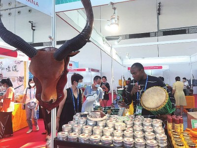 東博會上,來自“一帶一路”國家的非洲參展商不時擊鼓,吸引了不少觀眾。 本報記者 郭林攝/光明圖片