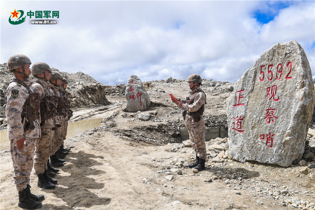 查果拉哨所官兵學習完回信后,面對榮譽旗幟莊嚴宣誓。王乾 攝