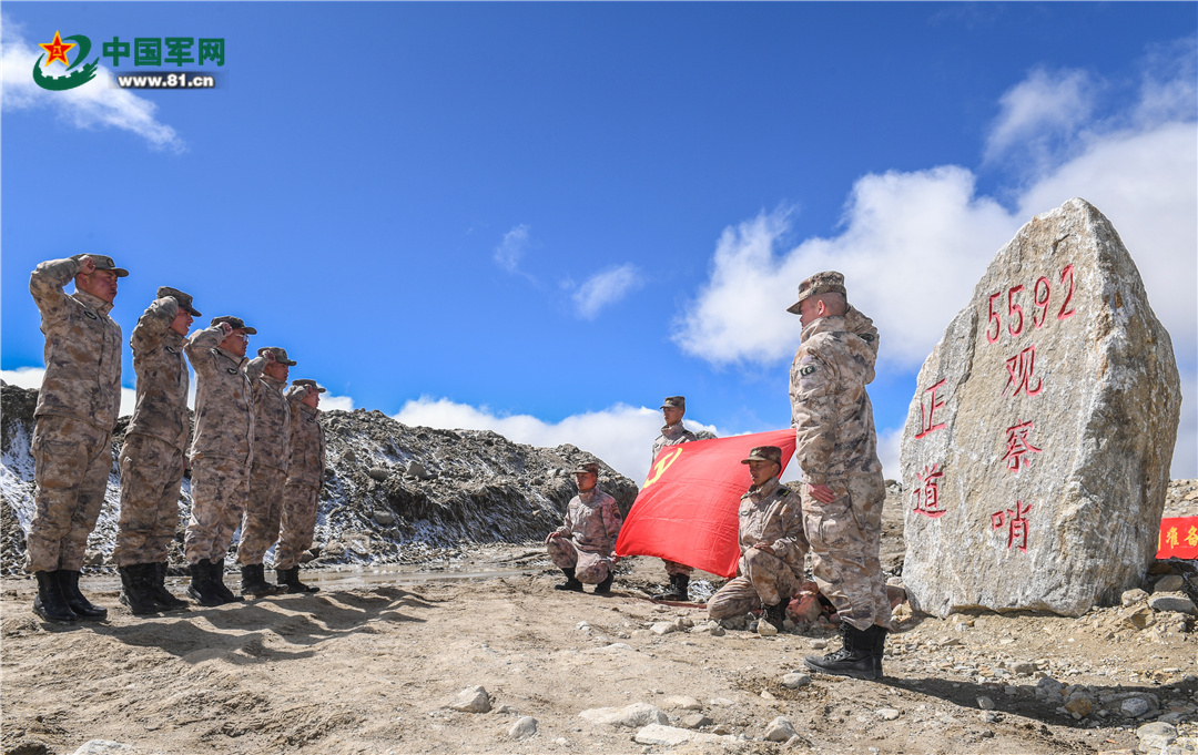 5592觀察哨官兵學習完回信后,面對黨旗鄭重承諾,為祖國站好崗、守好邊。陶云波 攝