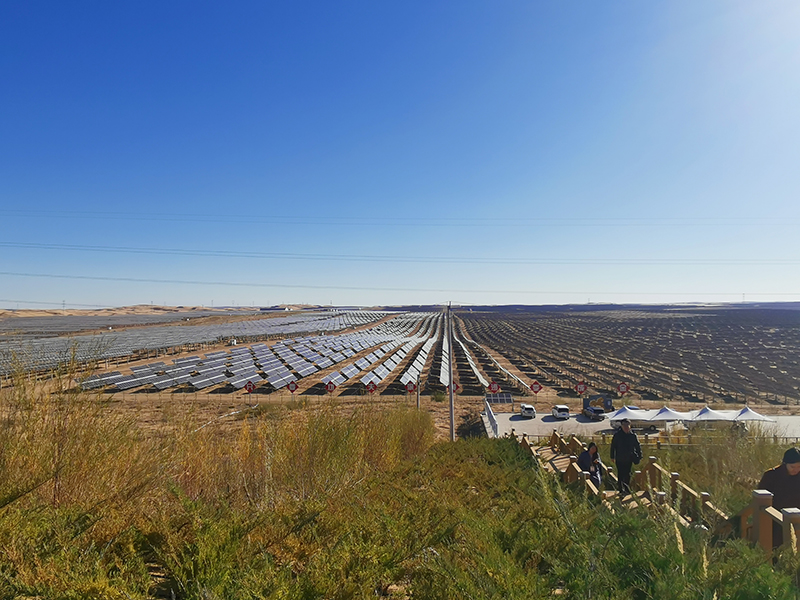 16日下午,記者們來到了位于庫布其沙漠中段達拉特光伏基地,這里天空碧藍,陽光金黃,空氣清新,視野遼闊,為光伏產業發展提供了優越的自然條件。