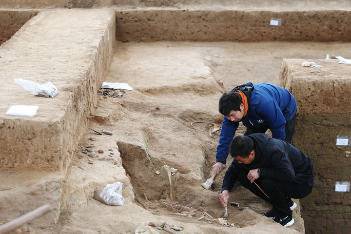 工作人員在仰韶村遺址第四次考古發(fā)掘現(xiàn)場(chǎng)作業(yè)(10月15日攝)。新華社記者 許雅楠 攝