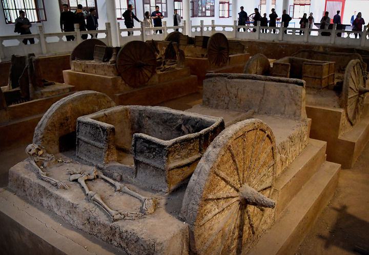 游客在河南安陽(yáng)殷墟宮殿宗廟遺址內(nèi)的車馬坑參觀(2018年10月14日攝)。新華社記者 李安 攝