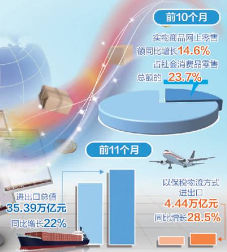 在消費資源全球化配置的今天,“買全球、賣全球”漸成新趨勢。作為消費新模式之一,跨境電商不僅是國內國際雙循環的重要鏈接點,也為消費擴容提質夯實了基礎。今年以來,新型消費業態和模式加速發展,國家統計局數據也印證了這一點:今年前10個月,實物商品網上零售額8.49萬億元,同比增長14.6%,占社會消費品零售總額23.7%。