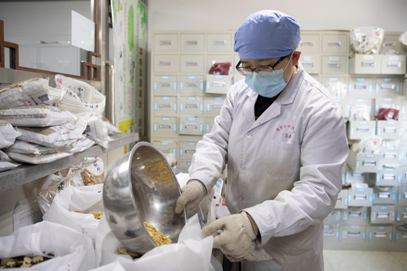 12月7日,在哈爾濱市道里區中醫醫院,工作人員在調配中藥用料。(新華社記者張濤 攝)