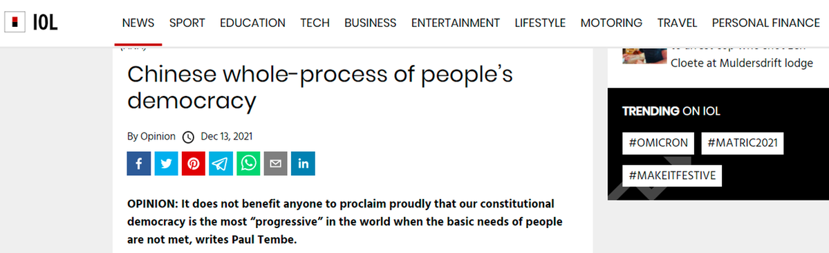 中國日報網(wǎng)12月21日電 12月13日,南非大學(xué)姆貝基非洲領(lǐng)導(dǎo)力研究院高級研究員譚哲理(Paul Tembe)在南非獨(dú)立在線新聞網(wǎng)站(IOL)發(fā)表評論文章,積極評價中國的全過程人民民主,認(rèn)為中國的民主制度實現(xiàn)了良政善治,南非可以從中學(xué)習(xí)借鑒以更好服務(wù)本國人民。