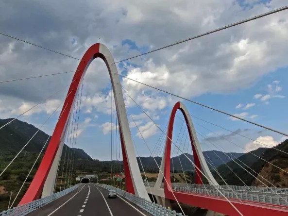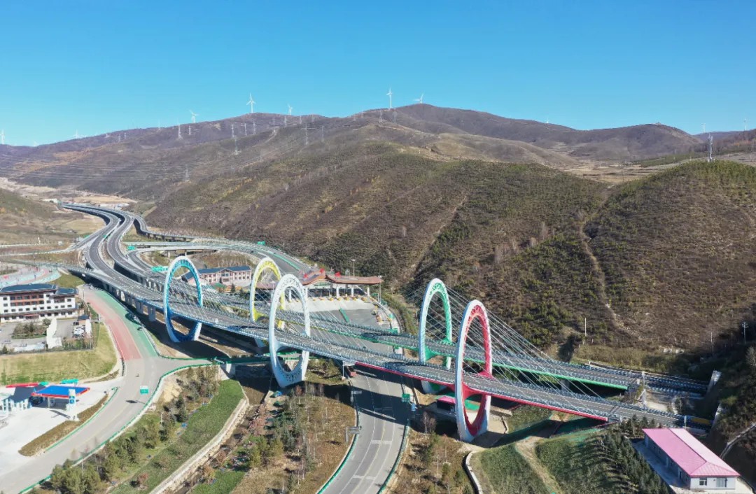 進入延崇高速河北段主線,迎冬奧氛圍撲面而來。圖為“奧運之門”——杏林堡大橋。(河北省交通運輸廳供圖)