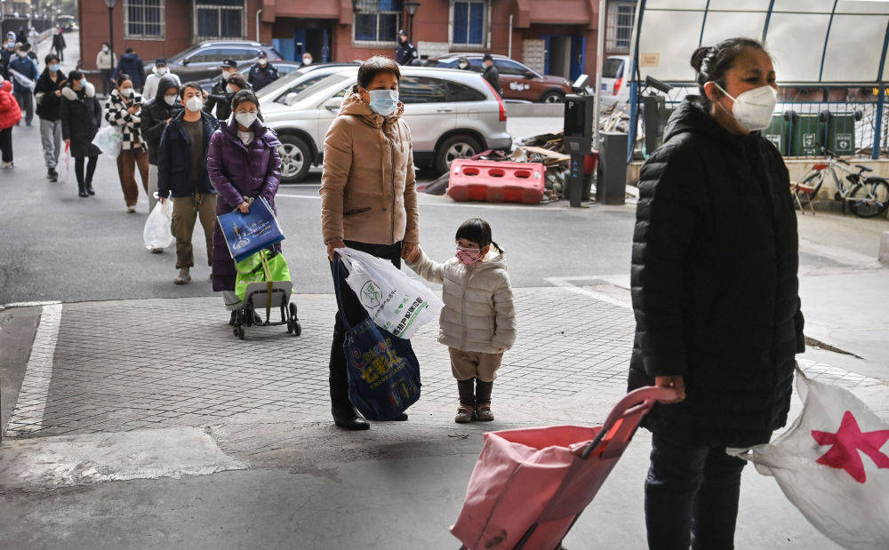 1月10日,雁塔區科技路一小區的居民排隊領取愛心人士捐贈的生活物資。新華社記者 陶明 攝