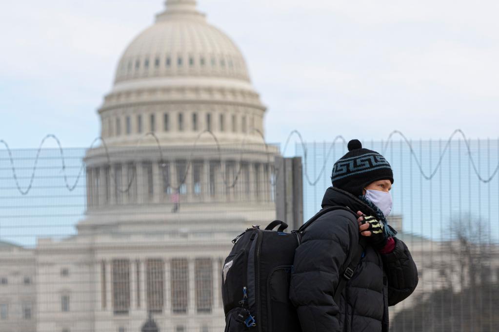 2021年1月24日,在美國(guó)首都華盛頓,一名男子戴著口罩從國(guó)會(huì)大廈附近經(jīng)過(guò)。新華社發(fā)(亞倫 攝)