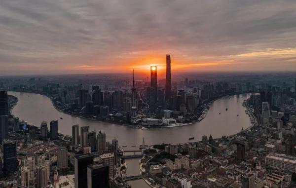 2022年1月1日拍攝的上海陸家嘴新年初升的太陽(無人機(jī)照片)。新華社發(fā)(楊帆 攝)