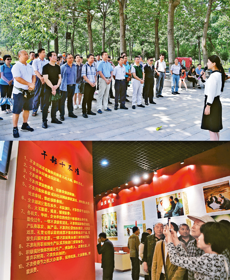 1966年2月,長篇通訊《縣委書記的榜樣——焦裕祿》播發(fā),焦裕祿的名字傳遍千家萬戶,成為共產黨人的光輝典范和全體黨員干部崇敬的榜樣。黨的十八大以來,習近平總書記多次勉勵廣大黨員干部學習弘揚焦裕祿精神,做焦裕祿式的好干部。上圖為2017年8月9日,黨員干部在焦裕祿干部學院聆聽焦桐的故事(新華社記者 馮大鵬/攝);下圖為2014年5月5日,干部群眾在焦裕祿同志紀念館觀看“干部十不準”展板(新華社記者 朱祥/攝)。