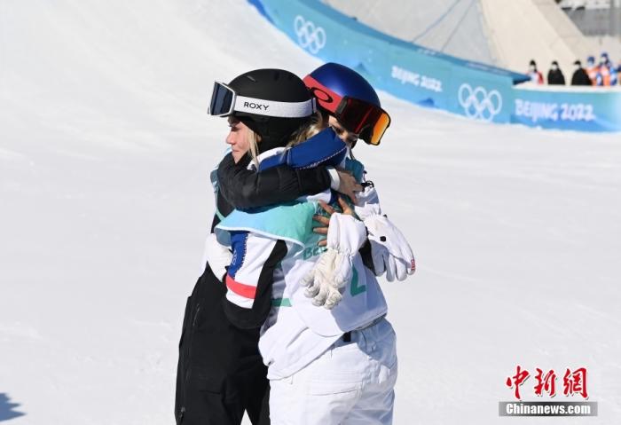 谷愛凌與獲得亞軍的法國選手泰絲·勒德擁抱。 中新社記者 毛建軍 攝