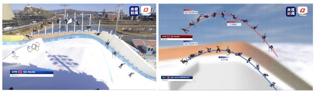 在滑雪大跳臺的8K節目制作中,總臺的“時間切片”系統可以逐幀抓取運動員從起跳到落地之間的空中姿態,運動員起跳后18秒內,就可用數據和圖形將他的運動表現分析呈現給觀眾。